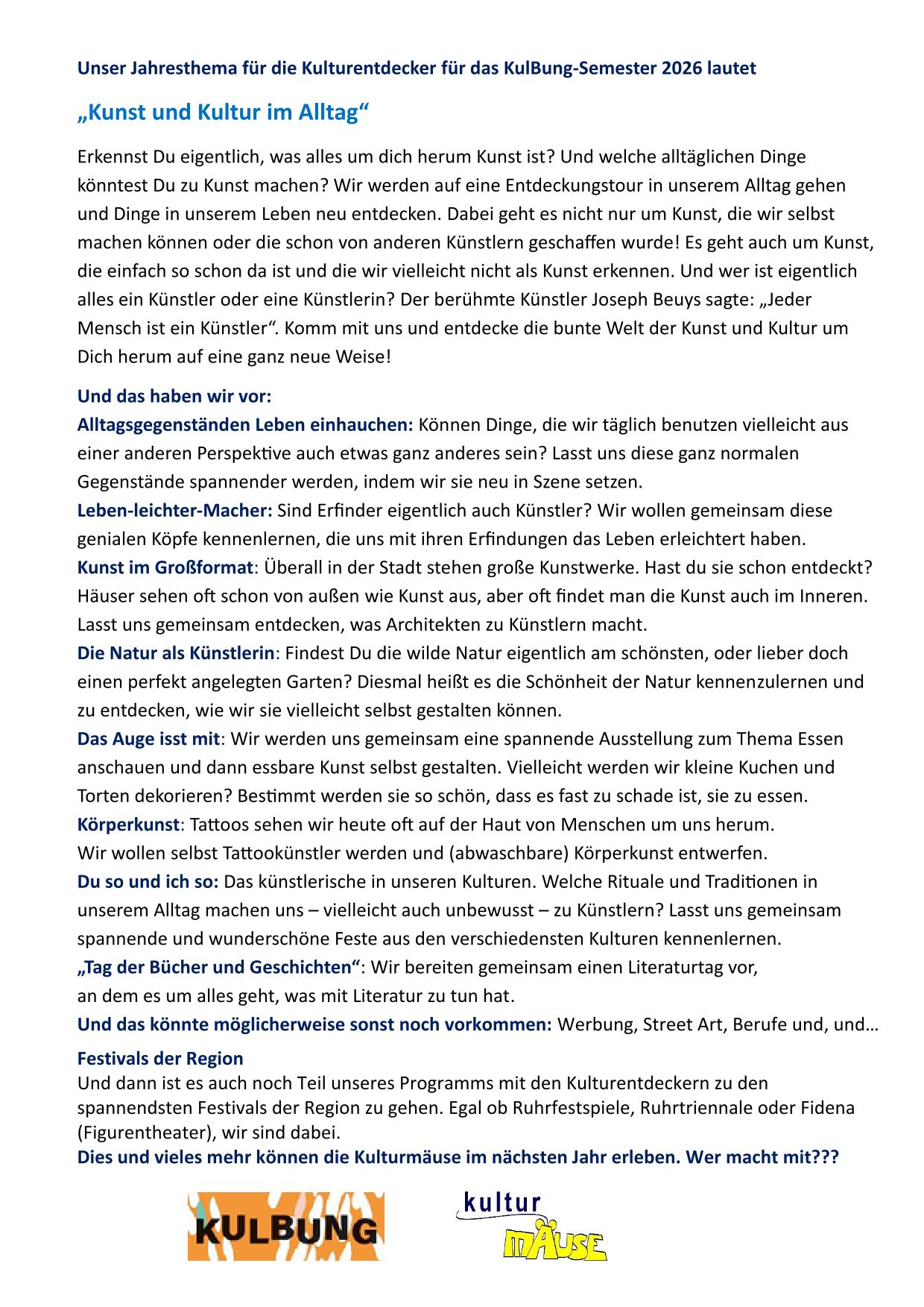 Die Kulturentdecker werden sich ein ganzes ein Jahr lang zu einem Jahresthema mit den verschiedenen Kunstbereichen beschäftigen.